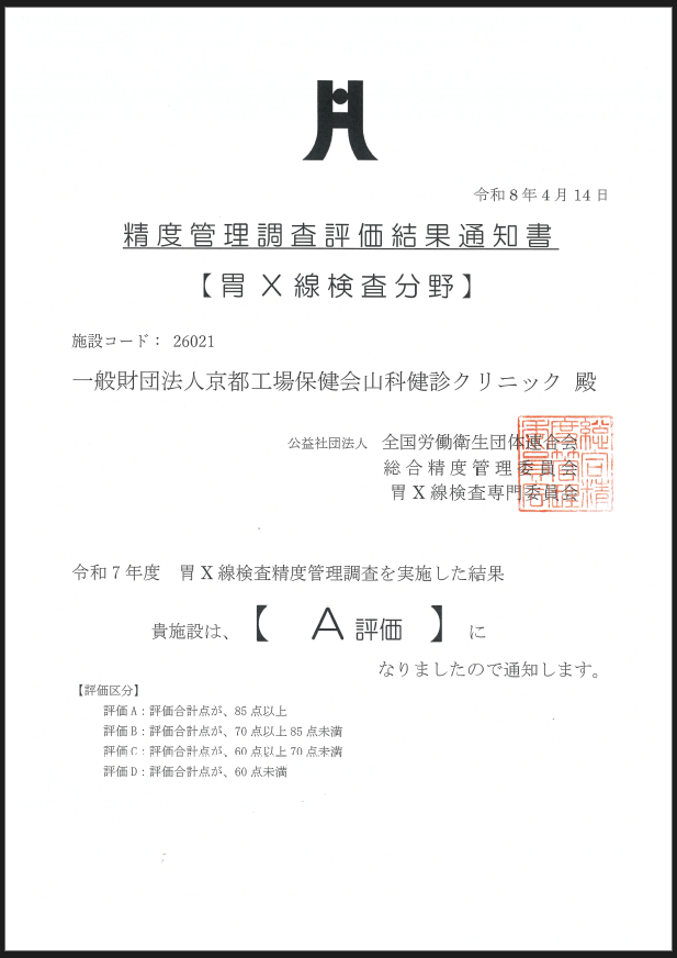 令和7年度の全国労働衛生団体連合会(全衛連)精度管理調査において、胃部X線検査分野で評価Aを取得いたしました。